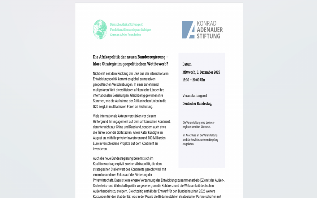 Teilnahme nur auf Einladung, bei Interesse melden Sie sich bitte bei Svenja Schindelwig, schindelwig@deutsche-afrika-stiftung.de.